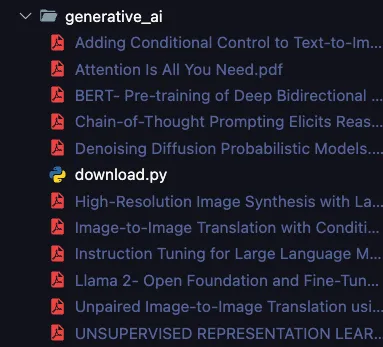 • data_source/generative_ai/download.py: File code dùng đểtải tựđộng một sốcác bài báo khoa học dưới dạng file pdf.